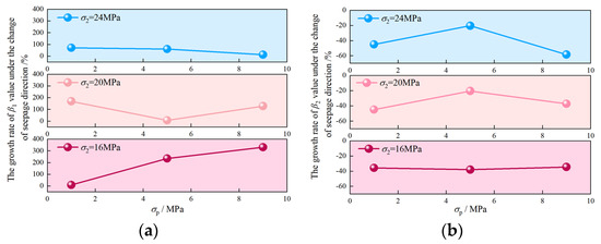 The differences in the variation patterns of characteristic stress under different seepage directions, shown in Figure 15a,b as well as Figure 16a,b, are usually because, under the loading condition of the maximum principal stress, the direction of crack propagation is closer to the direction of the maximum principal stress [44,45]. If the seepage direction is the same as the maximum principal stress direction, the fine particles in the mudstone temporarily block the seepage channels [54,55], weakening the influence of the permeation effect in a short period of time. Therefore, σci and σcd increase with an increase in permeation pressure. However, this influence disappears when the rock is about to fail; thus, strength still decreases with an increase in permeation pressure. Under the seepage condition in the direction of the intermediate principal stress, water can enter the crack through the entire crack surface, and the efficiency of reducing the effective stress is higher. Therefore, σci and σcd of the mudstone decrease with an increase in permeation pressure. In terms of volumetric dilation hysteresis effect, based on previous research inferences, under the seepage condition of the intermediate principal stress direction, since the water flow is impeded by the cracks, the softening of mudstone is relatively slower than that under the seepage condition of the maximum principal stress direction. Therefore, its dilatancy point is relatively delayed.