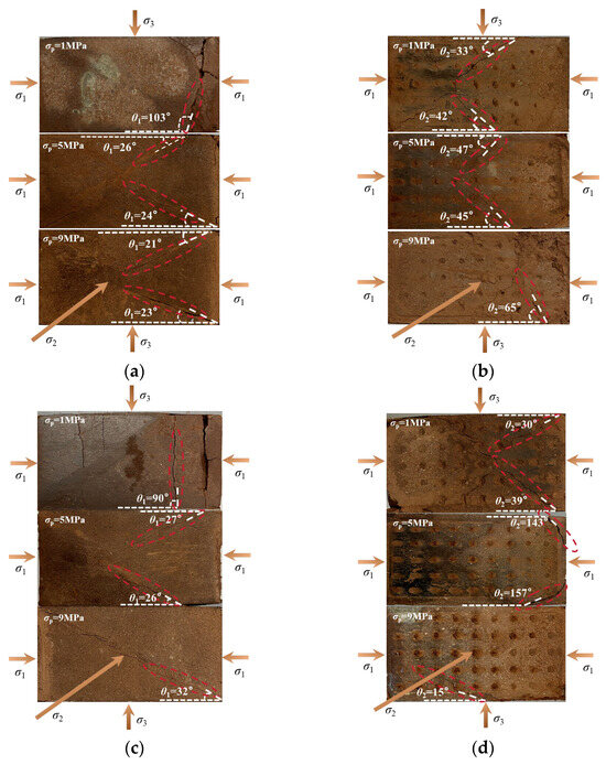 Figure 18 illustrates the failure modes of mudstone under seepage conditions in different principal stress directions. The specific method for measuring the rock fracture angle is as follows: After the rock specimen fails, take a photo of its σ1–σ3 plane, crop the photo as per the format shown in Figure 18 of this article, and then use an online protractor to take multiple measurements [52,53]. In the σ1–σ3 plane, let θ1 denote the angle between the fracture surface and the σ1 direction under the TTS-1 condition, and let θ2 represent the corresponding angle under the TTS-2 condition. As shown in Figure 18a,b, under the TTS-1 condition at σp = 1 MPa, the measured θ1 is 103°. This suggests that, under lower σp, the fracture surface of the mudstone forms a larger angle with the σ1 direction. With increasing σp, θ1 gradually decreases, indicating that the mudstone fracture surface progressively converges towards the σ1 direction. This trend indicates that, under high-σp conditions, the fracture surface of mudstone is more inclined to be consistent with the σ1 direction. However, under the TTS-2 condition, θ2 increases as σp rises. This indicates that, as σp increases, the fracture surface of mudstone progressively deviates from the σ1 direction. When σ2 = 16MPa and σp = 1 MPa, under the TTS-2 condition, at a lower σp, the angle between the fracture surface of the mudstone and the σ1 direction is smaller, and the fracture surface is relatively close to the σ1 direction.
