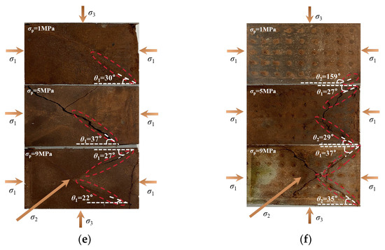 Failure modes of mudstone: (a) σ2 = 16 MPa (TTS-1) and (b) σ2 = 16 MPa (TTS-2); (c) σ2 = 20 MPa (TTS-1) and (d) σ2 = 20 MPa (TTS-2); (e) σ2 = 24 MPa (TTS-1) and (f) σ2 = 24 MPa (TTS-2).