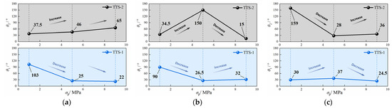 When σ2 is 20 MPa under the TTS-1 condition, as σp increases, the angle θ1 first decreases and then increases. After the seepage direction shifts from TTS-1 to TTS-2, the variation in the angle θ2 shows an inverse trend, increasing first and then decreasing. Under the TTS-1 condition with σ2 = 24 MPa, as σp increases, the angle θ1 first increases and then decreases. After the seepage direction shifts from TTS-1 to TTS-2, the variation in the angle θ2 shows an inverse trend, decreasing first and then increasing.