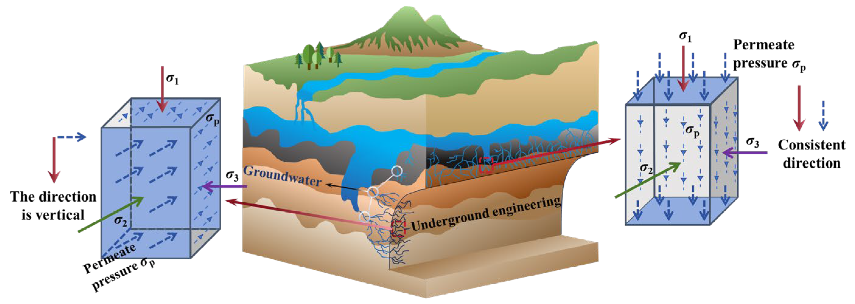 | Seepage Direction | σ1 (MPa) | σ2 (MPa) | σ3 (MPa) | σp (MPa) |