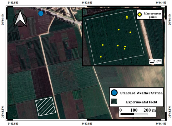 The field experiment was implemented at the Regional Field Crops Research Centre in Béja, northwestern Tunisia (36°44′05″ N, 9°13′35″ E). The study site is situated within the country’s main cereal belt and is characterized by a Mediterranean sub-humid climate with a temperate, hot, and dry summer according to the Köppen–Geiger climate classification [37]. The annual rainfall ranges between 500 and 850 mm and mean daily temperatures range from about 8 °C in winter to 30 °C in summer [4]. A map of the study area showing the experimental wheat field, the location of the meteorological station, and the sampling positions for the SWC and gCC measurements is provided in Figure 1.