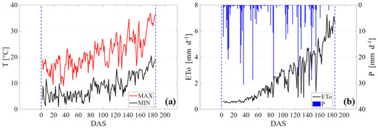 Temporal dynamics of maximum (MAX) and minimum temperature (MIN) (a), and crop reference evapotranspiration (ETo) and precipitation depth (P) (b); the blue dashed lines indicate the sowing and the harvest.