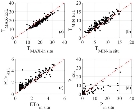 Comparison between (a) daily maximum temperature, (b) daily minimum temperature, (c) daily crop reference evapotranspiration, and (d) daily precipitation depth registered by the standard weather station installed in the field and retrieved by the reanalysis data; the dashed red lines represent the 1:1 line (perfect match).