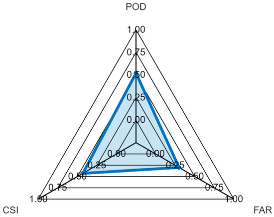 In addition to the statistical indicators (Table 3), the reliability of E5L precipitation was evaluated using event-based indices (Table 4). Daily precipitation events were defined as days with precipitation greater than 0 mm. Three categorical indices were applied: Probability of Detection (POD), False Alarm Ratio (FAR), and Critical Success Index (CSI). POD measures the fraction of observed events that were correctly predicted, FAR quantifies the fraction of predicted events that did not occur, and CSI accounts for both missed and falsely predicted events, providing a balanced assessment of categorical skill [69]. These metrics were derived from a 2 × 2 contingency table, where a = hits (observed and predicted), b = misses (observed but not predicted), and c = false alarms (predicted but not observed) [70].