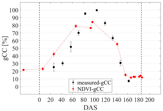 Comparison of measured-gCC and NDVI-gCC dynamics; the blue dashed lines indicate the sowing and the harvest; error bars for measurements represent the standard deviation of the nine field measurement points.