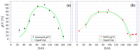 Comparison of AquaCrop-simulated gCC vs. (a) measured-gCC and (b) NDVI-gCC; the blue dashed line indicates the sowing and the harvest timing; error bars for measurements represent the standard deviation of the nine field measurement points.