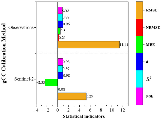 Statistical evaluation of AquaCrop gCC simulations against measured-gCC (Observations) and NDVI-gCC (Sentinel-2) during the 2024–2025 growth season; the dashed line divides the statistics referred to Observations and Sentinel-2.