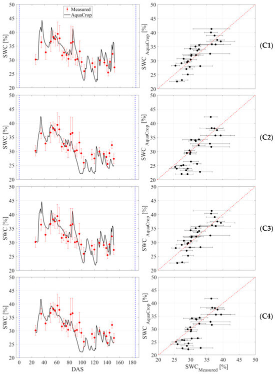 Simulated (red dots with red standard deviation bars of the nine field measurements) and observed (black lines) soil water content (SWC) time series (left panels) and SWCmeasured vs. SWCAquaCrop scatterplots (right panels) under the four input combinations (C1–C4); (C1) in situ and measured-gCC; (C2) E5L and measured-gCC; (C3) in situ and NDVI-gCC; (C4) E5L and NDVI-gCC; the blue dashed lines on the time series indicate the sowing and the harvest timing, whereas on the right panels, the 1:1 (perfect match) is shown with dashed red lines.