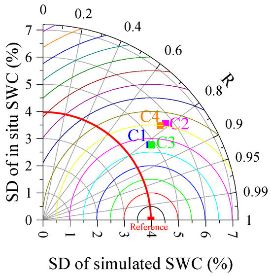 The Taylor diagram (Figure 9) provides a complementary evaluation of model performance by jointly analyzing the R, SD, and RMSEc between simulated and observed SWC. Combinations C1 and C3 exhibited the highest correlations (R = 0.82 and 0.83, respectively) and the lowest RMSEc values (2.1% and 2.3%), with standard deviations (SD = 0.95–0.98) closely matching the observed variability. In contrast, C2 and C4 showed weaker correlations (R = 0.63 and 0.61) and higher RMSEc values (3.4% and 3.6%), together with slightly underestimated standard deviations (SD = 0.85–0.88).