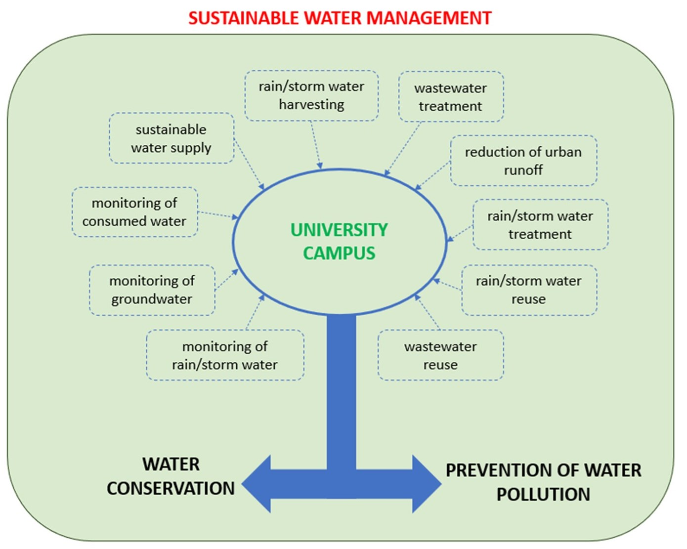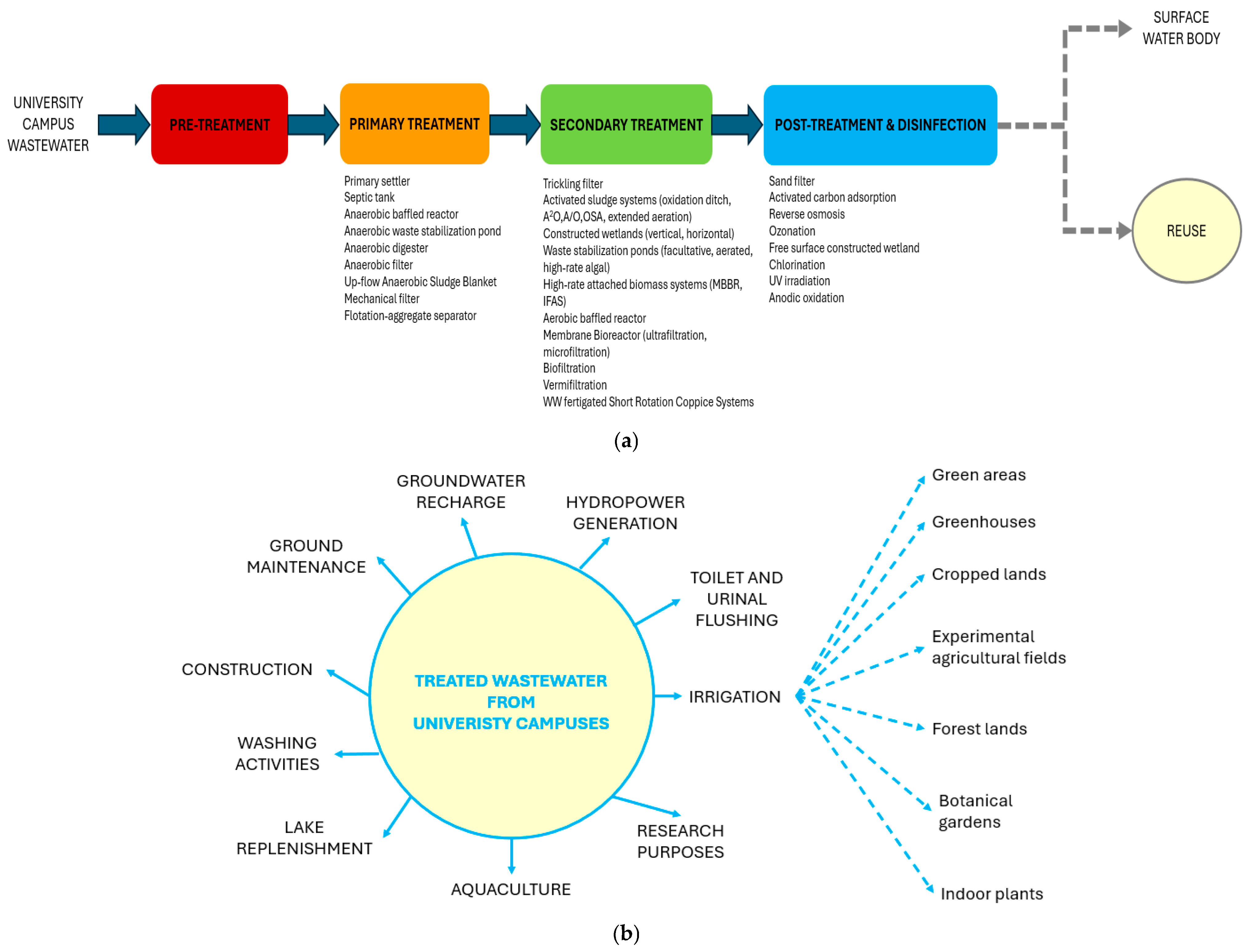 - When the university campus is located in places where a connection to a sewer system could result physically and/or economically unfeasible, by preventing the direct discharge of wastewater pollutants into the environment [337],