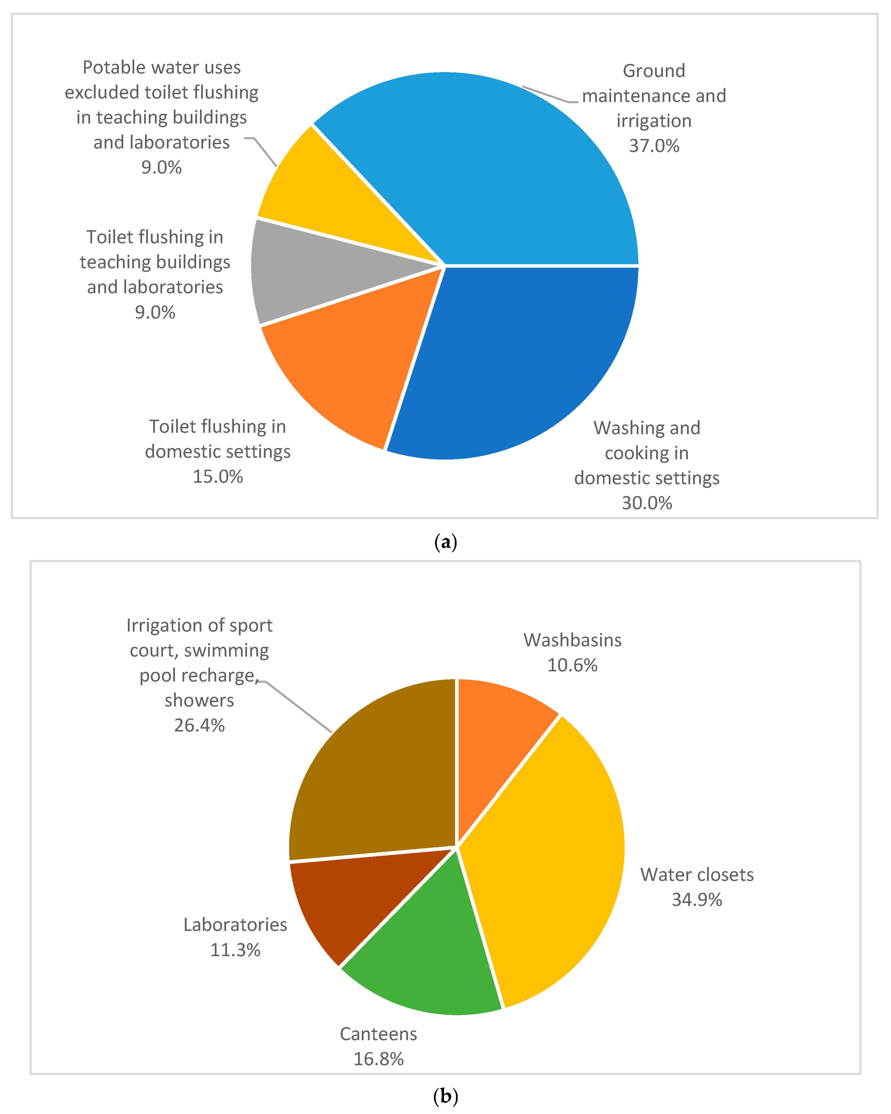 - Measures minimizing the release of micropollutants in wastewater. With the objective of preventing pollution due to release of contaminated water from university campuses, one topic that did not emerge from this review is the issue of micropollutant release through HEIs’ wastewater in the environment. Among the typical micropollutants released in wastewater that can be input into the water cycle through the human usage of PPCPs, such as detergents for the cleaning of toilets and other washroom accessories as well as soaps used for personal hygiene, there are several molecules that are persistent and therefore cannot be removed from wastewater through conventional treatment technologies, nor undergo significant degradation in the environment. Specific energy-demanding treatment processes would need to be installed [457]. If not removed from wastewaters, these molecules accumulate in bodies of water [457], thereby potentially threatening fish species and humans [458]. This problem has become such a concern that the recast of urban wastewater treatment directive in the European Union has prescribed quaternary treatment for the removal of a selected list of micropollutants from urban wastewaters [459]. The input of persistent micropollutants into water bodies by HEIs can be particularly concerning given the fact that people tend to spend a large portion of the day in them and hygiene measures require, in most cases, that toilets and washbasins be cleaned daily, contrary to what happens to domestic household infrastructures, besides frequent handwashing [460]. Therefore, preventing water micro-pollution is key to reducing the workload of wastewater treatment plants and safeguarding the environment and can be considered a core action for water sustainability in HEIs. Specific actions that can be undertaken by HEIs are as follows: