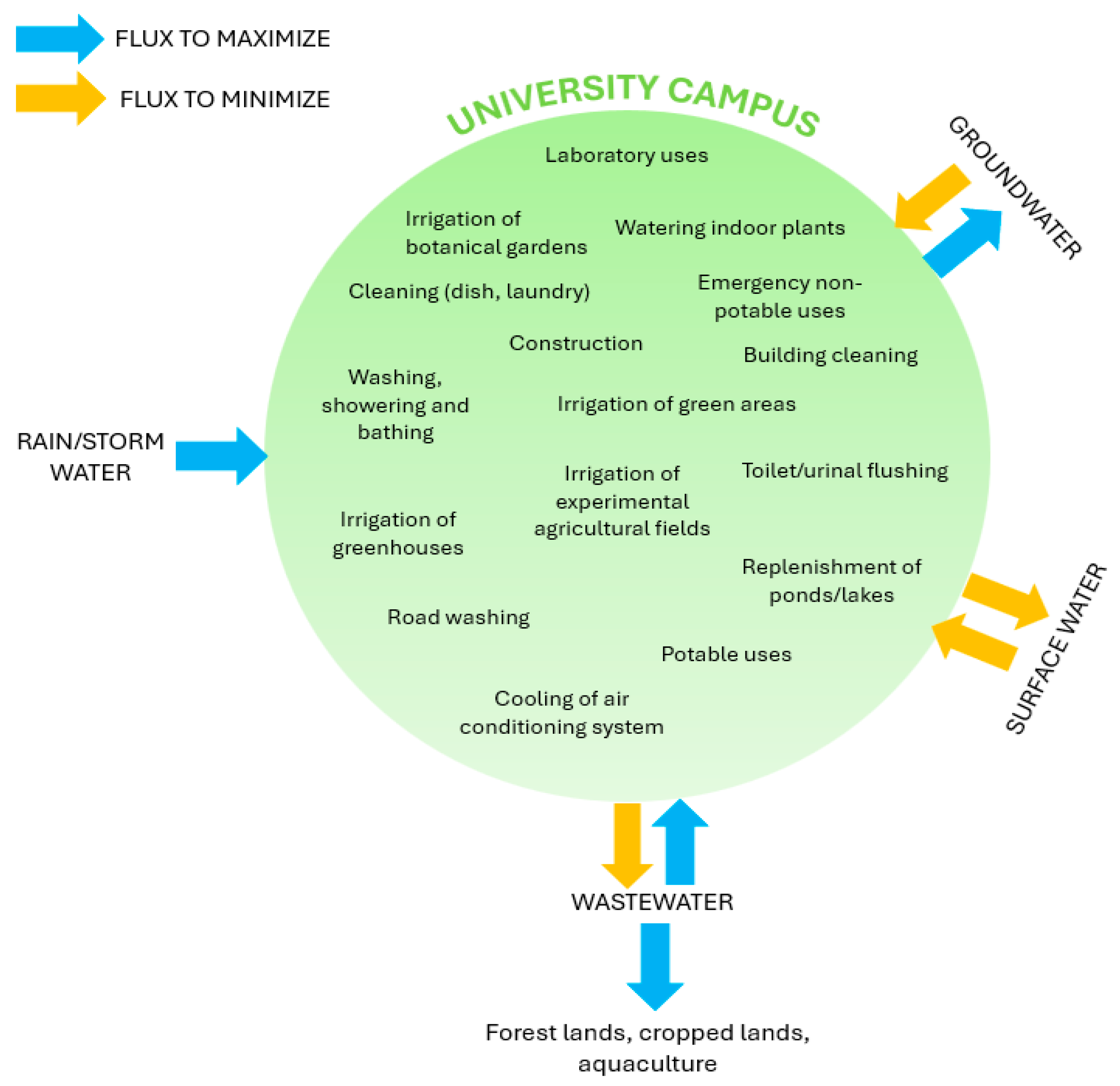 - When the university campus is close to gardens and/or agricultural fields [338], by increasing the chances for water reuse and resource recovery,