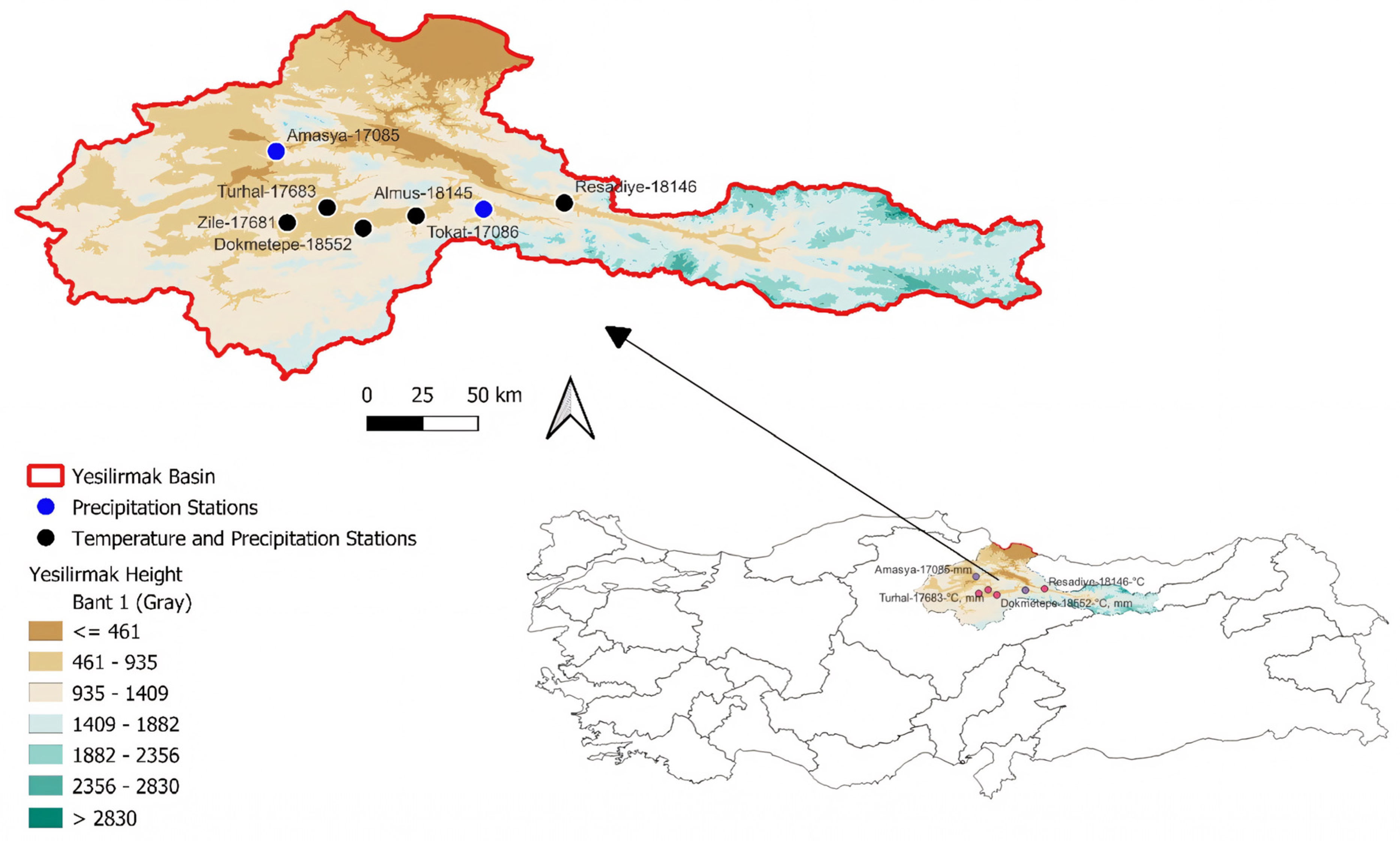 Situated within the transitional zone between the humid, rainy Black Sea climate and the arid, harsh continental climate of Central Anatolia, the basin is located in the Black Sea Region of Türkiye, approximately between 40°20′–41°50′ north latitudes and 35°00′–37°20′ east longitudes. Although the basin is generally influenced by the Black Sea climate due to its geographical location, its wide topographical range—from humid coastal areas to drier inland zones—leads to substantial spatial variations in temperature and precipitation. The coastal areas along the Black Sea are characterized by a humid, mild, and rainy climate; in contrast, the regions closer to Central Anatolia exhibit lower humidity, arid conditions, and more severe continental characteristics. In mountainous zones, cold and humid conditions prevail [