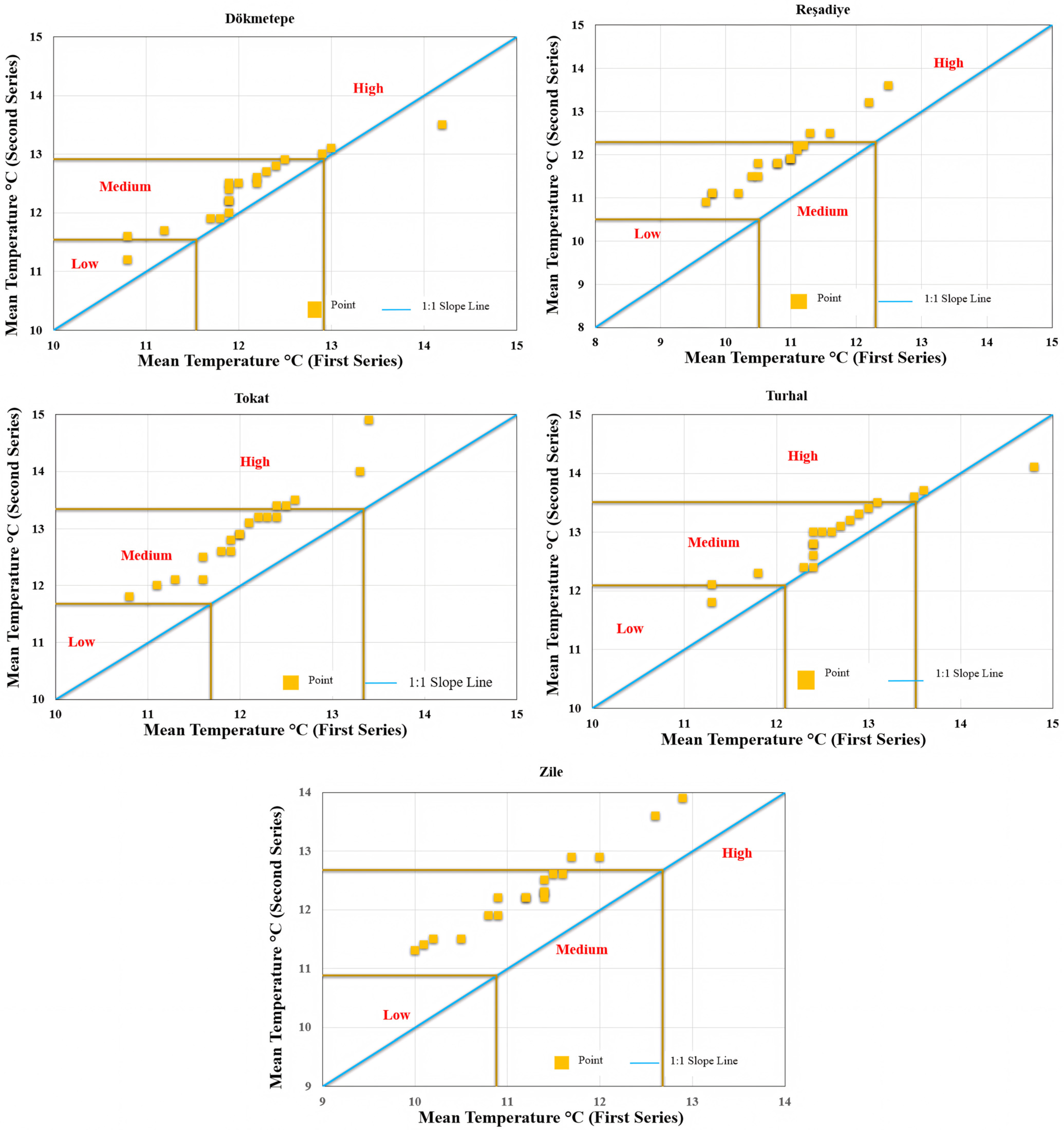 In spring, the MK test detected significant upward trends at Zile (Z = 1.80) and Reşadiye (Z = 1.86), while Turhal and Dökmetepe exhibited negative but statistically insignificant Z-values. However, the ITA method complemented the MK results by identifying increasing trend structures in low- to medium-temperature ranges, even in stations where MK fell below the significance thresholds. In this way, ITA was able to capture emerging patterns that were not fully detected by the classical analysis.