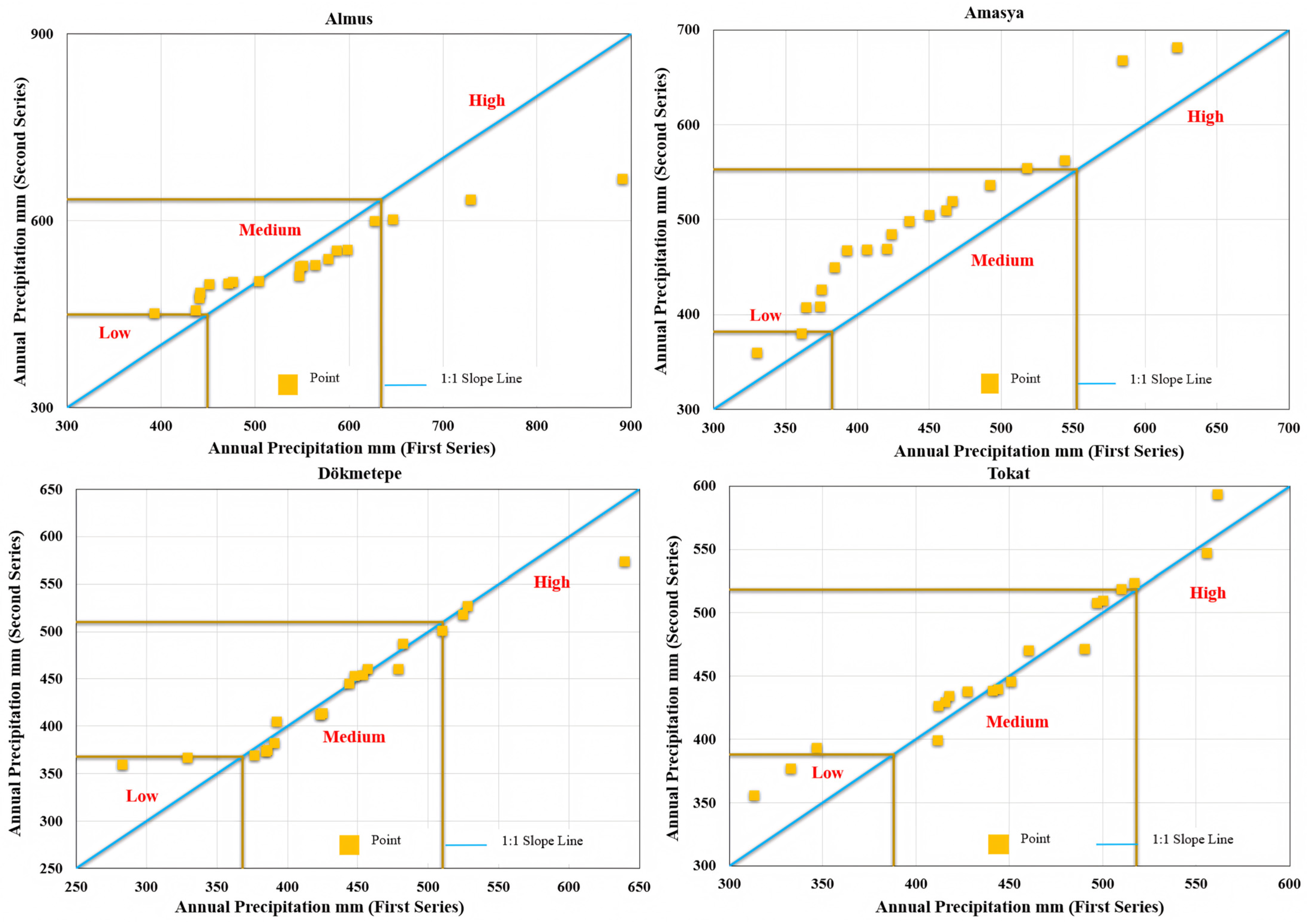 In the annual precipitation analyses, the MK test showed positive trends at Amasya (Z = 1.33), Tokat (Z = 1.06), and Dökmetepe (Z = 1.03). These trends were structurally reinforced by the ITA method, which illustrated a long-term upward tendency through the clustering of data points in the low- to medium-precipitation ranges. This consistency across methods emphasizes the presence of a subtle yet gradually intensifying change in annual precipitation patterns.