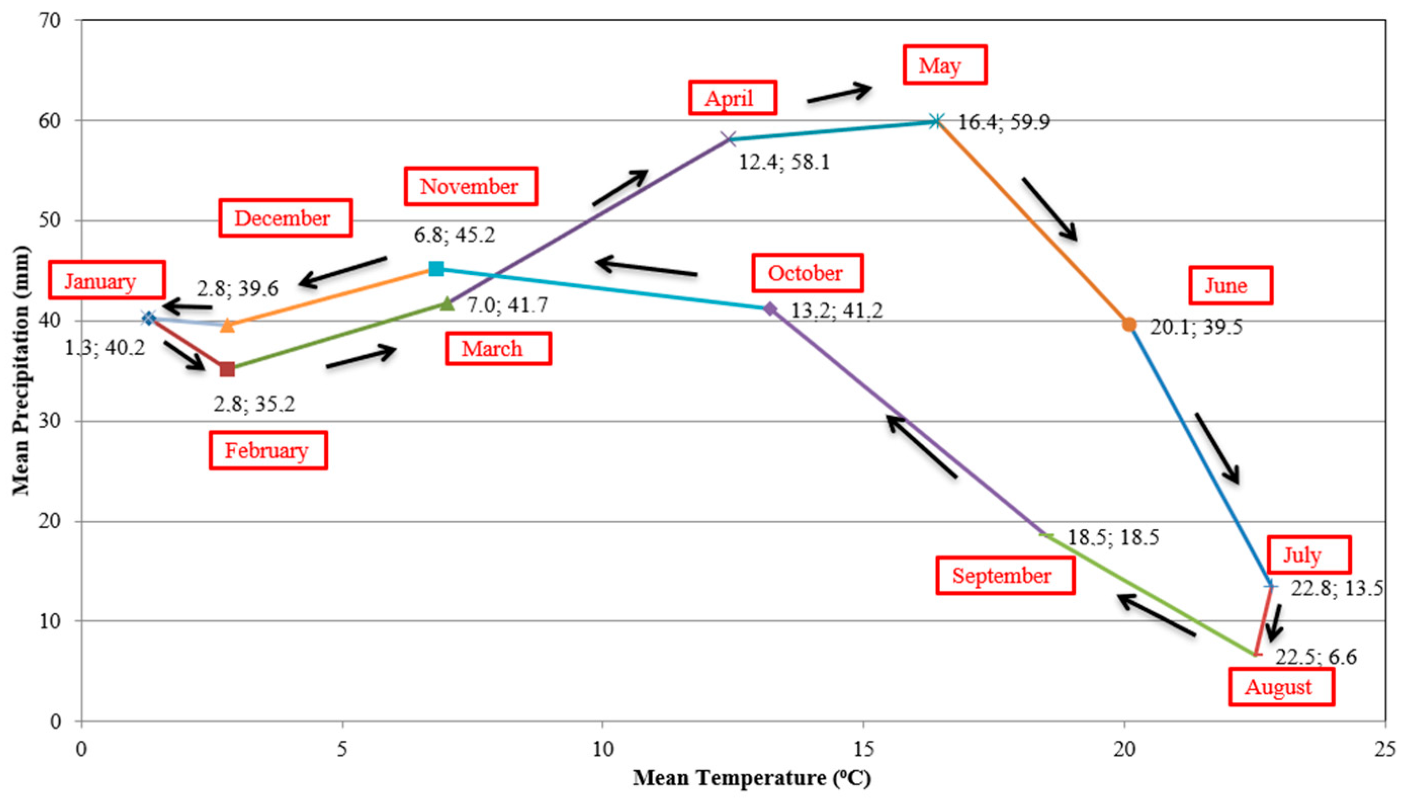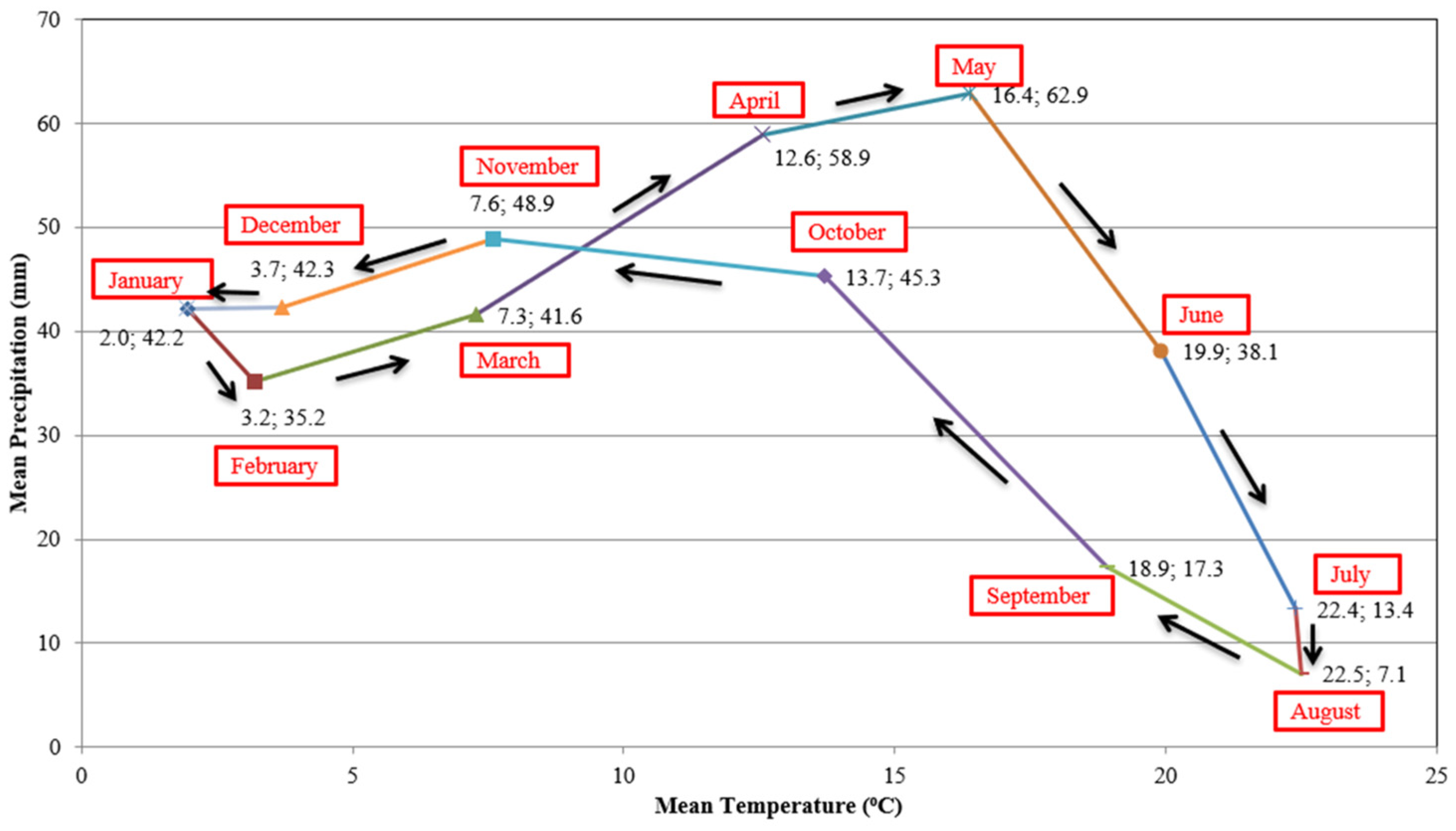 For each selected station, monthly mean precipitation and temperature values for the period 1975–2012 were plotted on scatter diagrams. Each point was labeled with its corresponding month, and the points were connected sequentially in calendar order, forming polygonal paths. The slope, direction, and geometry of these polygons provide insights into seasonal climatic behavior: