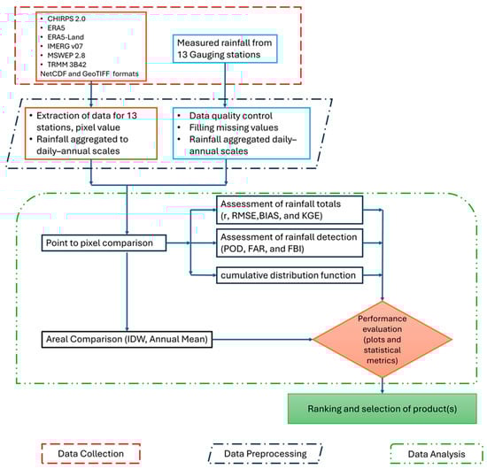 Data preprocessing involved several steps to prepare the rain gauge and satellite data for point-to-grid comparisons. The temporal resolution of the SREs was adjusted by aggregating them to daily and monthly scales to match the rain gauge records for further analysis. Satellite data extraction involves selecting grid cells corresponding to rain gauge locations through the nearest-neighbor method (pixel to point approach) and pairing the temporal resolution to a common scale, such as daily or monthly. The analysis period for both the SREs and rain gauge data covered 2005 to 2019. The detailed methodological procedures applied in this study are outlined in Figure 2.