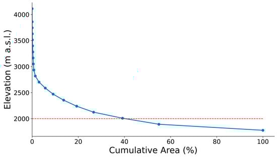 Hypsometric curve derived from DEM of the basin. The red dashed line indicates the threshold (2000 m) used to classify the highland and lowland stations.