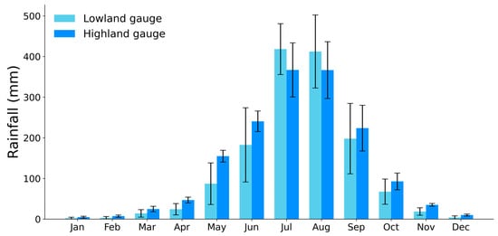 Mean monthly rainfall (histogram) and standard deviation of monthly rainfall (vertical lines) (2005–2019) for lowland (n = 6) and highland (n = 7) gauging stations in the Lake Tana Basin.