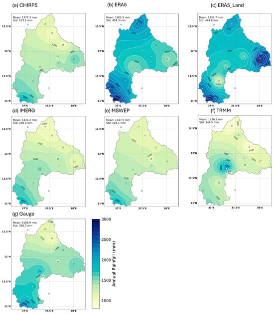 The spatial distribution of mean annual gauged precipitation (g) and satellite and reanalysis precipitation (SREs) products (a–f) was interpolated using the inverse distance-weighted interpolation. A common legend is used for visual comparison across datasets. The white contours represent isohyets of mean annual rainfall. The values in the top-left corner are the mean annual rainfall and standard deviation taken over the entire domain for the respective satellite product. The gauge stations are annotated in circles.
