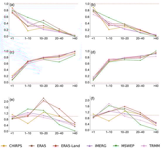 Median values of Panels (a,b) POD, (c,d) FAR, and (e,f) FBI for the six SREs. For each metric, the right-hand panels (a,c,e) represent highland stations, while the left-hand panels (b,d,f) represent lowland stations. The red dashed lines represent the optimal reference values.