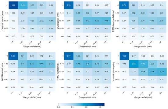 Figure 7 illustrates the confusion matrix (also referred to as the matching matrix), which summarizes the ability of the SREs to replicate rain gauge measurements across all stations. This comparative evaluation approach was adapted from the methodology depicted in [70]. Ideally, if the SREs perfectly match the gauged data, the matrix would form a diagonal structure, where all off-diagonal elements are zero and only the diagonal from the upper-left to the lower-right corner contains one. For example, the first column shows the distribution of SREs when the gauge rainfall values were less than 1 mm/day. CHIRPS exhibited the highest matching percentage (89%), followed by IMERG (81%), whereas ERA5-Land (74%) showed the lowest detection capacity for no-rain or low-intensity rainfall events. For the second column (1–10 mm/day) and third column (10–20 mm/day) rainfall classes, MSWEP shows relatively higher detection capability, although the performance is still not strong. The detection rates for the second and third classes were 58% and 38%, respectively. For the fourth (20–40 mm/day) and fifth (>40 mm/day) rainfall classes, all SREs indicate very low detection capability, with most showing detection rates below 20%.