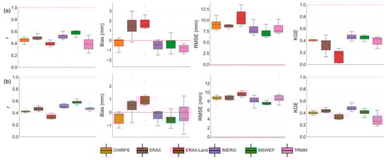 Box plots of for highland (a) and lowland (b) stations, summarizing the values of r, bias (mm), RMSE (mm), and KGE for daily SREs versus ground observations. The red dashed line indicates the ideal value, the perfect agreement between SREs and gauged data. The box center shows the median, with upper and lower edges representing the 75th and 25th percentiles. Whiskers indicate values within 1.5×IQR (Interquartile range). Circles correspond to station-level observations that fall outside the whisker range (outliers).