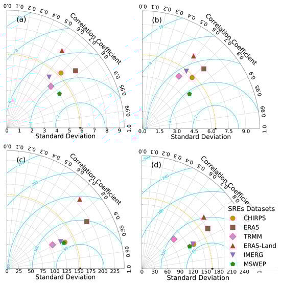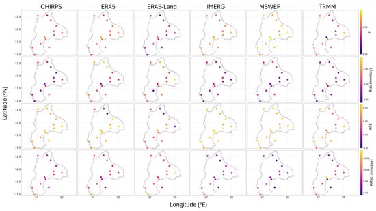Continuous statistical methods assess the quantitative agreement between satellite rainfall estimates and ground-based observations. These methods involve evaluating the magnitude of rainfall estimates using metrics such as Mean Bias Error (MBE) to identify systematic deviations; Root Mean Square Error (RMSE) to assess overall average errors; and Pearson correlation coefficient (r) to measure linear relationships and Kling–Gupta Efficiency (KGE) combines correlation, bias, and variability in its equation to provide an overall measure of how well satellite rainfall data matches observed data. In addition, the Taylor diagram is utilized for evaluating SREs, providing a robust graphical representation of the alignment between patterns and observations [60]. This diagram summarizes three frequently used error metrics: correlation coefficient, centered (unbiased) RMSE, and standard deviation, all within a single framework, to assess the performance of SRE datasets in comparison to the gauge. For comparison, the products were analyzed at daily and monthly time scales, with all sub-daily SRE products aggregated to daily totals and, subsequently, to monthly totals. These metrics provide insights into the accuracy, bias, and variability of satellite rainfall products. The equations for these metrics are listed in Table 6.