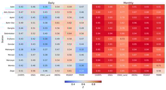 Correlation heatmap of daily and monthly SREs datasets across different stations. The y- axis represents the stations.
