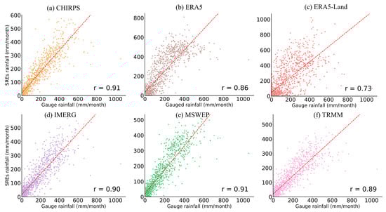 In terms of continuous metrics, MSWEP consistently outclassed the other products on the daily scale. On the monthly scale, all SREs achieved high correlation values (r > 0.75), indicating excellent agreement with the gauge. ERA5 and ERA5-Land captured high-intensity rainfall events relatively well, and they tended to significantly overestimate mean annual rainfall, resulting in poor overall performance. By contrast, MSWEP, CHIRPS, and IMERG demonstrated the best balance between accuracy and consistency across all metrics, rainfall categories, and terrain types. While MSWEP, CHIRPS, and IMERG are generally reliable for long-term hydrological applications, users should exercise caution when applying these products for extreme rainfall events, as their accuracy tends to decrease under very high-intensity conditions.