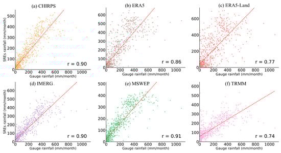 At the monthly scale, MSWEP, CHIRPS, and IMERG achieved the highest ranks across all continuous metrics (r, bias, RMSE, and KGE), reflecting strong agreement with gauge-based rainfall patterns. ERA5 and ERA5-Land remained the least accurate, with significantly higher bias. All SREs showed a tendency to overestimate light rainfall, though MSWEP and TRMM limited this bias to a slight level, while CHIRPS, ERA5, ERA5-Land, and IMERG showed double overestimation. Under moderate-to-heavy rainfall, all products demonstrated from low to higher underestimation bias.