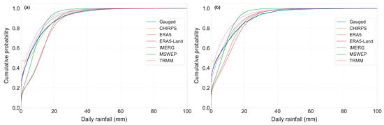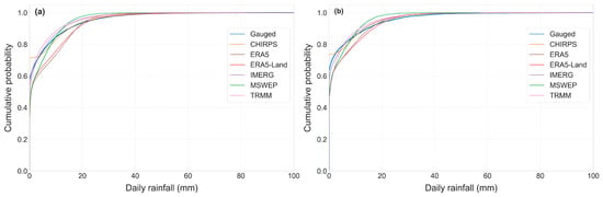 Among the assessed products, IMERG exhibited shows low relative bias values across all quantiles and both regions, indicating strong agreement with observed data. TRMM also performed well, maintaining relatively low and stable bias, especially in the highland region. CHIRPS showed moderate performance, with slight overestimation at lower quantiles and a transition toward underestimation in the lowland region at higher quantiles. In contrast, ERA5 and ERA5-Land demonstrated substantial overestimation at the median (50% quantile), particularly in the highland region, and a sharp reduction in bias at higher quantiles, indicating inconsistent performance. MSWEP displayed high positive bias at lower quantiles but improved performance at higher quantiles. Overall, TRMM and IMERG appear to be reliable datasets for capturing daily rainfall characteristics across varying rainfall intensities and topographic conditions.
