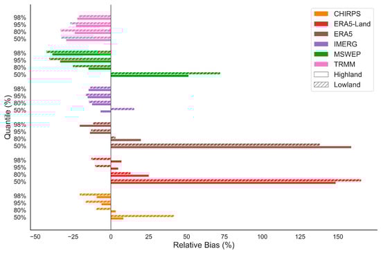 Relative bias (%) of cumulative distribution functions (CDFs) of satellite rainfall estimates (SREs) compared to gauge-based observations across quantiles (50%, 80%, 95%, and 98%) for highland (solid bars) and lowland (hatched bars) regions.
