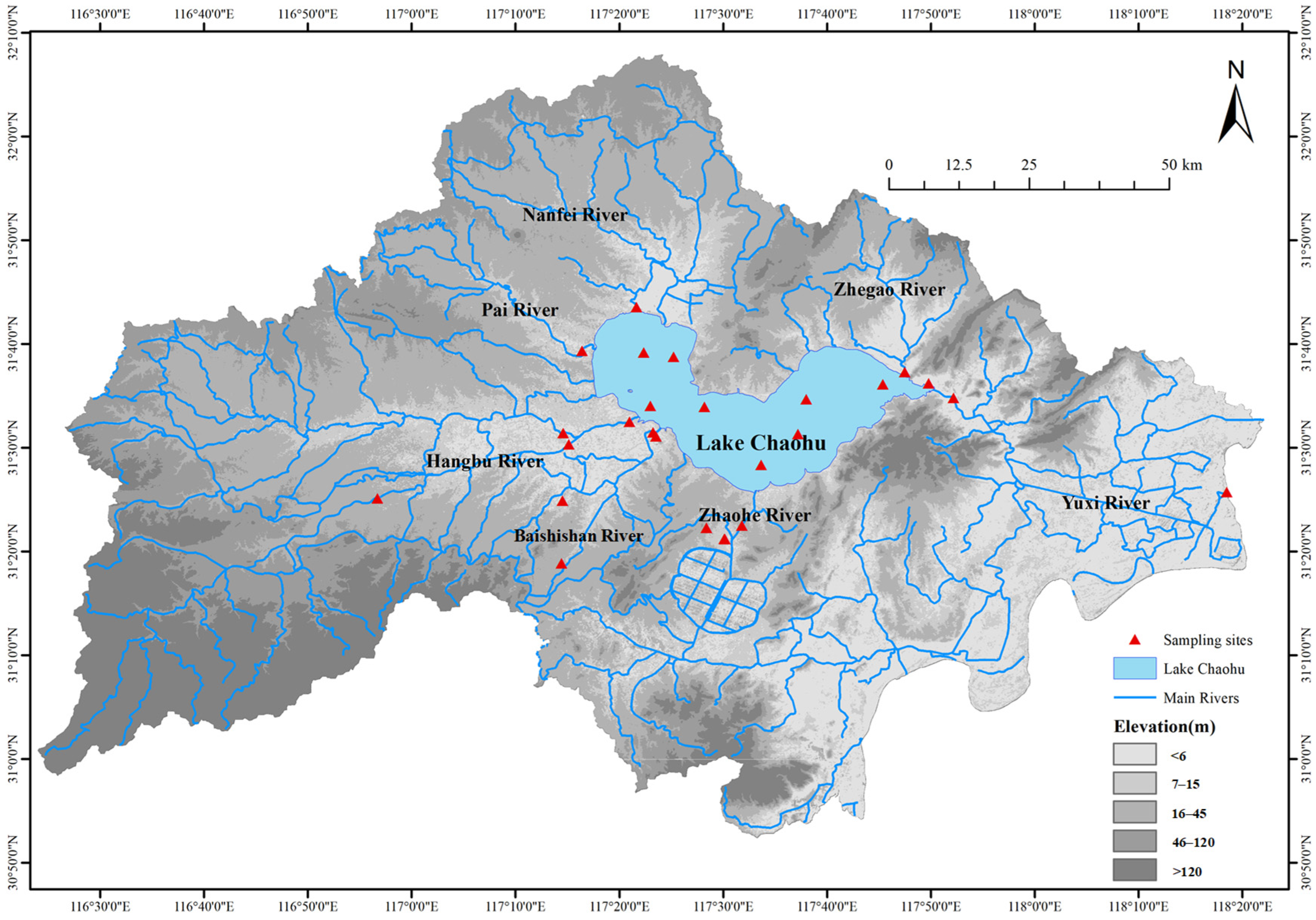 - Wu, L.; Zhang, Y.; Chen, Y.; Geng, M.; Chen, X. Distribution of water environmental factors and evaluation of trophic state in the river-lake system of Chaohu Lake Basin. J. Hydroecol. 2023, 44, 65–72. (In Chinese) [Google Scholar]