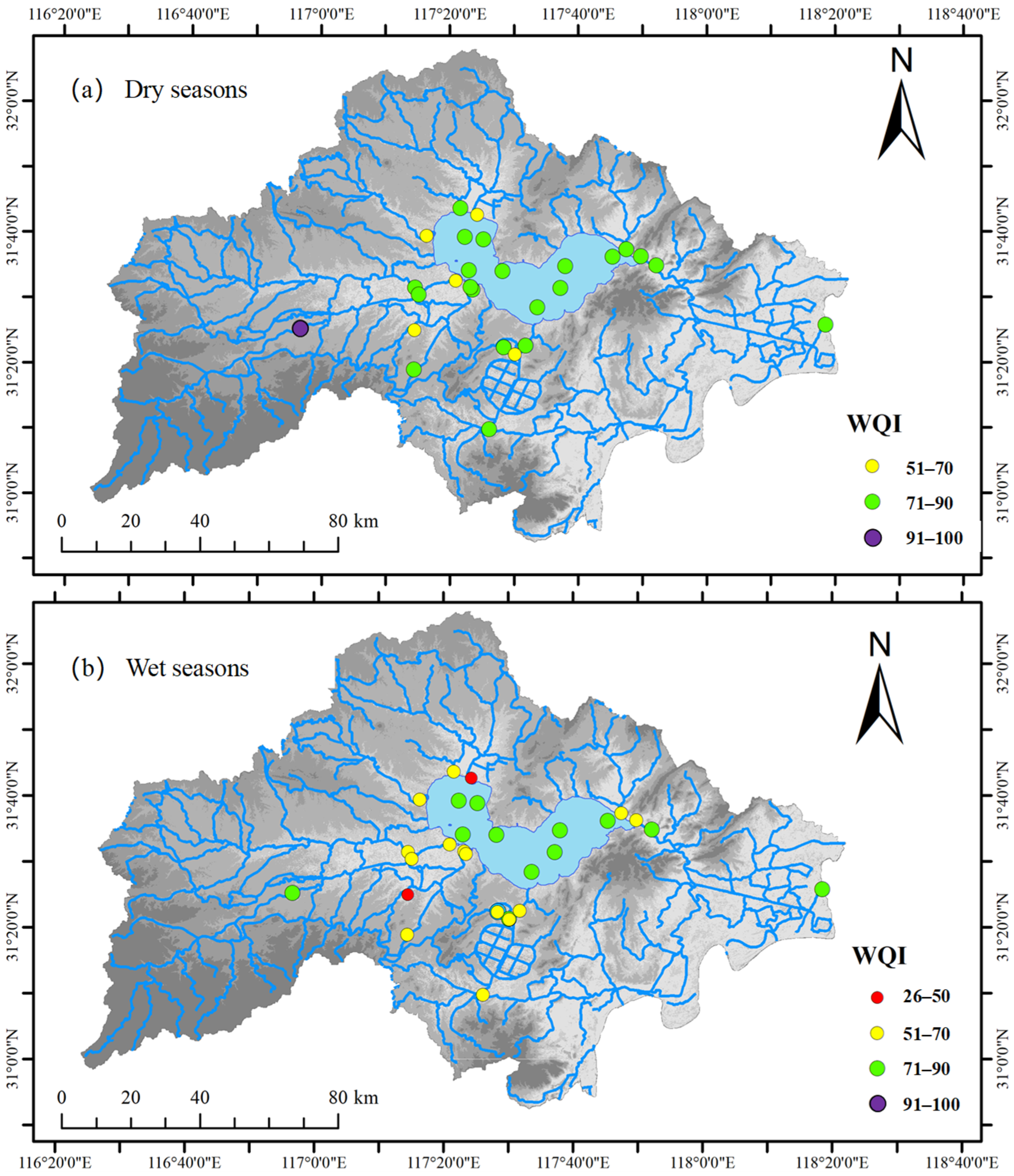 - Wu, Z.; Zhang, D.; Cai, Y.; Wang, X.; Zhang, L.; Chen, Y. Water quality assessment based on the water quality index method in Lake Poyang: The largest freshwater lake in China. Sci. Rep. 2017, 7, 17999. [Google Scholar] [CrossRef]
