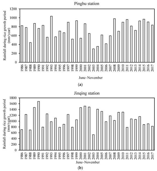 Rainfall data from the rice-growing season (June–November) during 1986–2017 at Pinghu, Jinqing, and Yongkang stations were analyzed. Assuming spatial uniformity of rainfall within the representative regions, the temporal distribution and variability of rainfall at each station were examined.