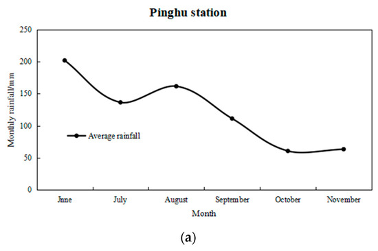 As shown in Figure 3, rainfall at Pinghu Station ranged from 61 mm in October to 202 mm in June. Rainfall from June to September accounted for 83% of the seasonal total, showing an overall decreasing trend, with a pronounced decline after August. At Jinqing Station, monthly rainfall ranged from 80 mm (October) to 291 mm (August). Rainfall from June to September accounted for 84% of the seasonal total, also displaying an overall decreasing trend with a sharp reduction after August. In addition, rainfall fluctuated between June and August, first decreasing and then increasing, followed by a marked decline from August to November. At Yongkang Station, rainfall ranged from 64 mm (October) to 268 mm (June). Rainfall from June to September accounted for 82% of the seasonal total, showing a pattern similar to Pinghu Station, with an overall downward trend and a sharp decline after August.