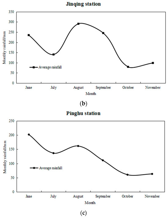 Variation of average monthly rainfall during the rice-growing season (June–November) from 1986 to 2017 at the representative stations (a) Pinghu, (b) Jinqing and (c) Yongkang.