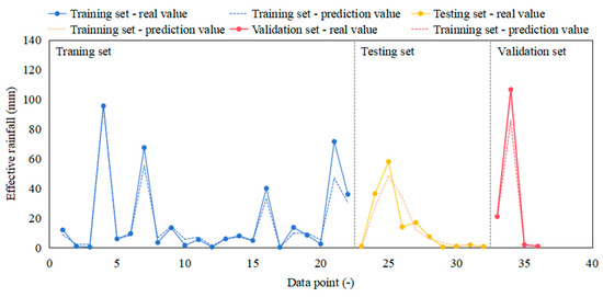 The results indicate that the optimal parameters were obtained as and . On the testing dataset, the coefficient of determination reached , and the root mean square error (RMSE) was 4.584 mm. These results demonstrate that the predicted values are highly consistent with the observed values, suggesting that the SVR model can effectively capture the nonlinear relationship between rainfall characteristics and the effective precipitation coefficient. Because the field-measured data required for the soil–water balance (including crop transpiration, deep percolation, irrigation depth and drainage) were only available at Pinghu station during 2018–2020, the SVR model was developed and validated exclusively for this station, which is taken as a representative irrigated paddy area in East China.