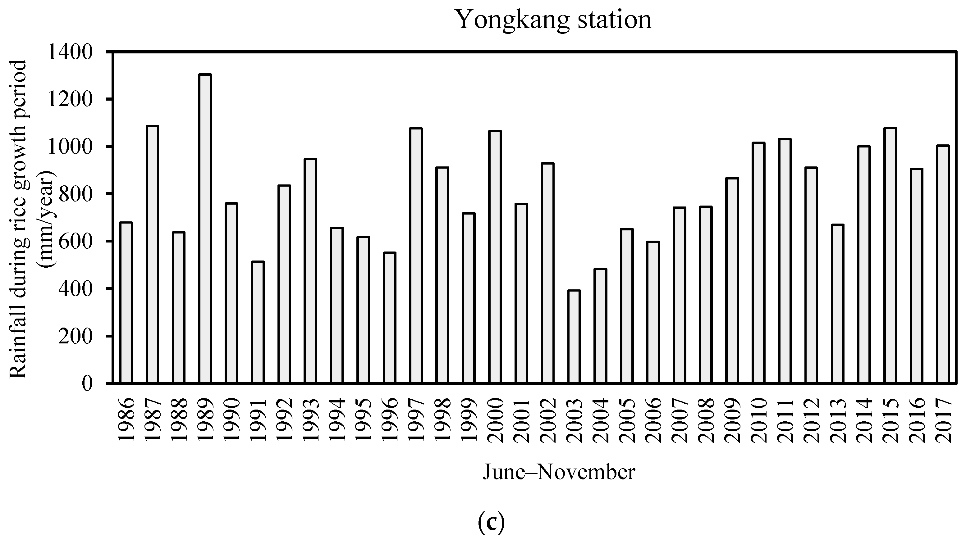 - The mean seasonal rainfall during 1986–2017 show significant interannual variability among the three stations of interest. The historical data suggests that more than 60% of the rainfall occurs during the rice-growing season, providing favorable water availability for rice production.