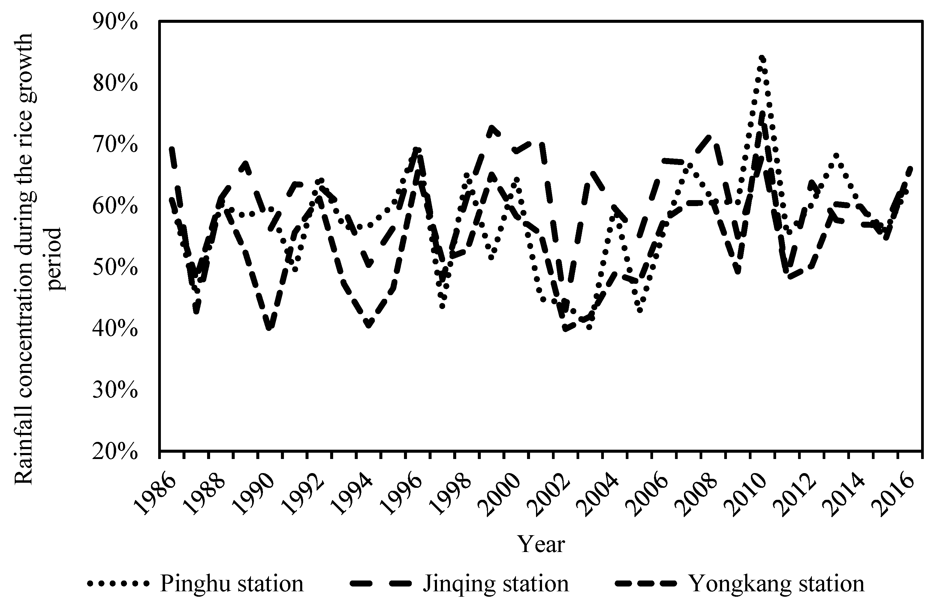 3.1.2. Rainfall Concentration During the Rice-Growing Season