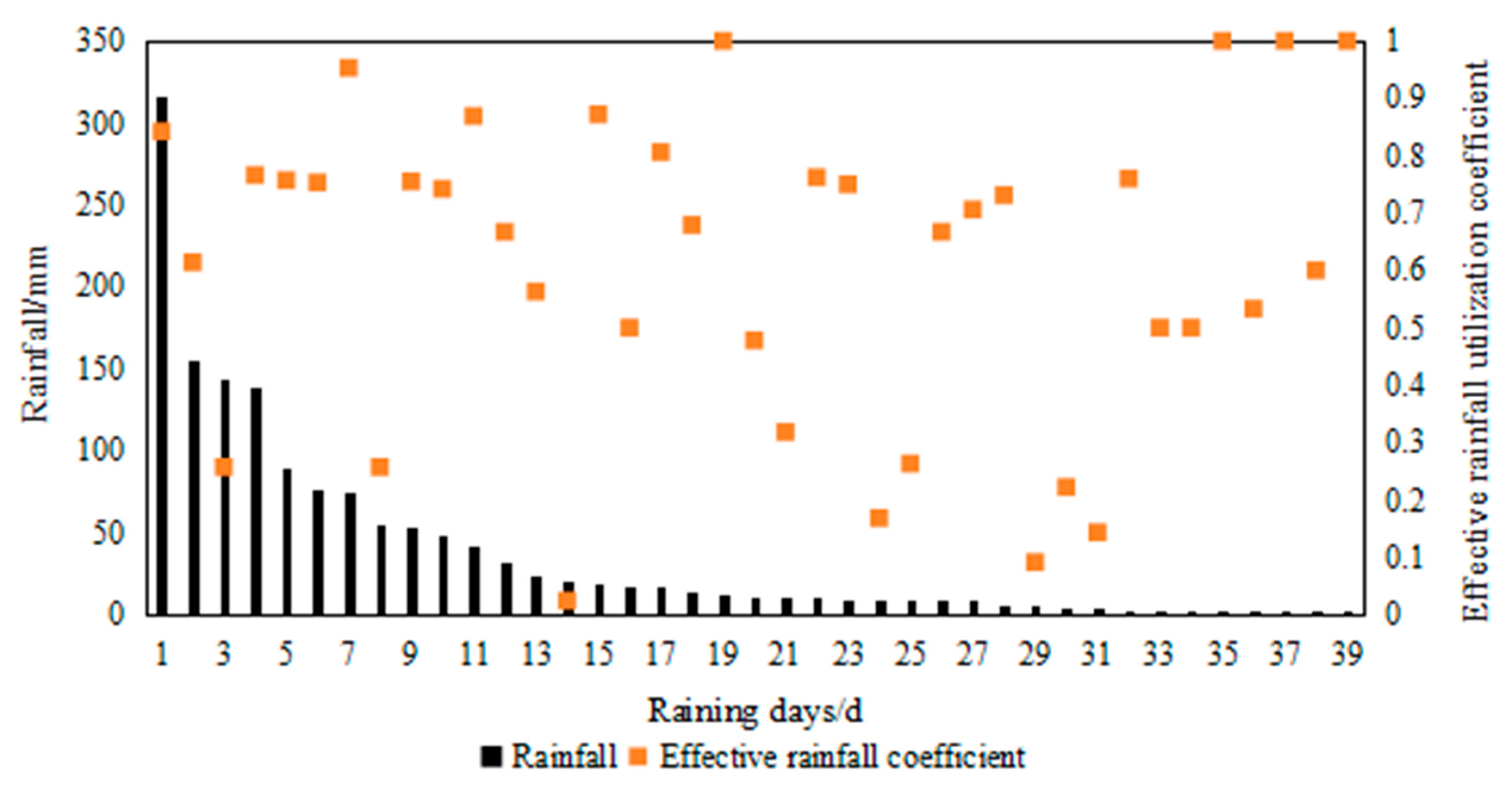 - The effective precipitation utilization coefficient showed non-linear responses to rainfall magnitude. High coefficients were observed for both heavy rainfall events and small showers, suggesting efficient water use, whereas moderate rainfall showed more variability, influenced by soil moisture and field management practices.