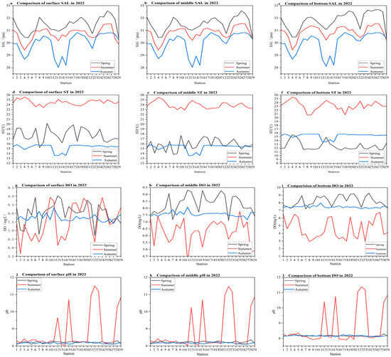 The analysis of seawater SAL revealed that the overall salinity trends in the surface, middle, and bottom layers were consistent, with SAL in spring > summer > autumn (Figure 2a–c).