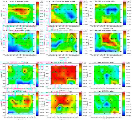 Comparison of the ΔST, Δ SAL, and ΔDO: (a–c) in spring; (d–f) in summer; (g–i) in autumn; (j–l) ΔpH in spring, summer, and autumn.