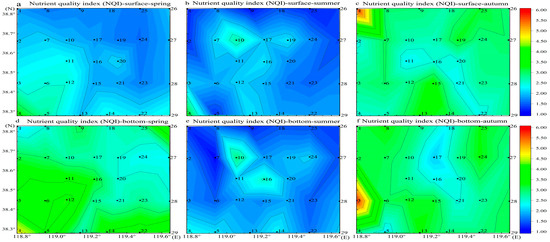 NQI of surface and bottom layers in the study area (a,d) in spring; (b,e) in summer; (c,f) in autumn in 2022.