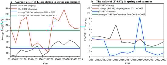 Comparison of YRRF at Lijin Station and (T-SST) with multi-year values: (a) YRRF in spring and summer at Lijin Station from 2010 to 2023; (b) (T-SST) in the CBS in spring and summer from 2011 to 2022.