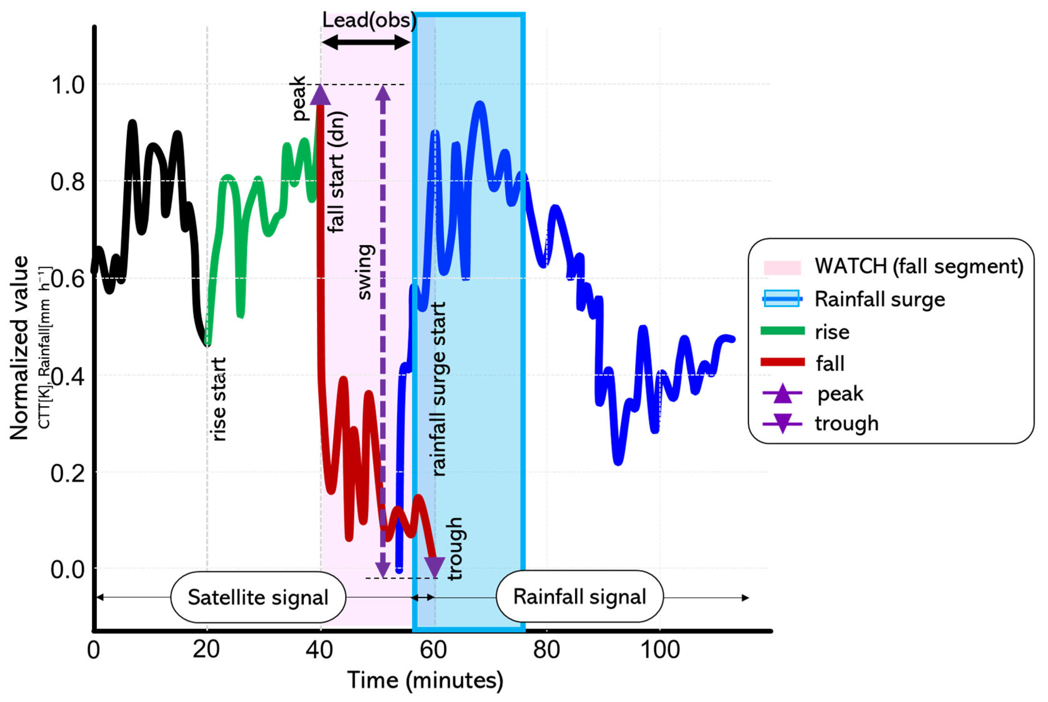 12], and they did not establish a clear quantitative temporal correspondence between satellite-based variables such as CTT and ground-observed rainfall intensification captured by radar. In other words, they were successful in identifying convection, but they did not explicitly measure how much earlier the satellite signal appears before the rainfall actually intensifies.