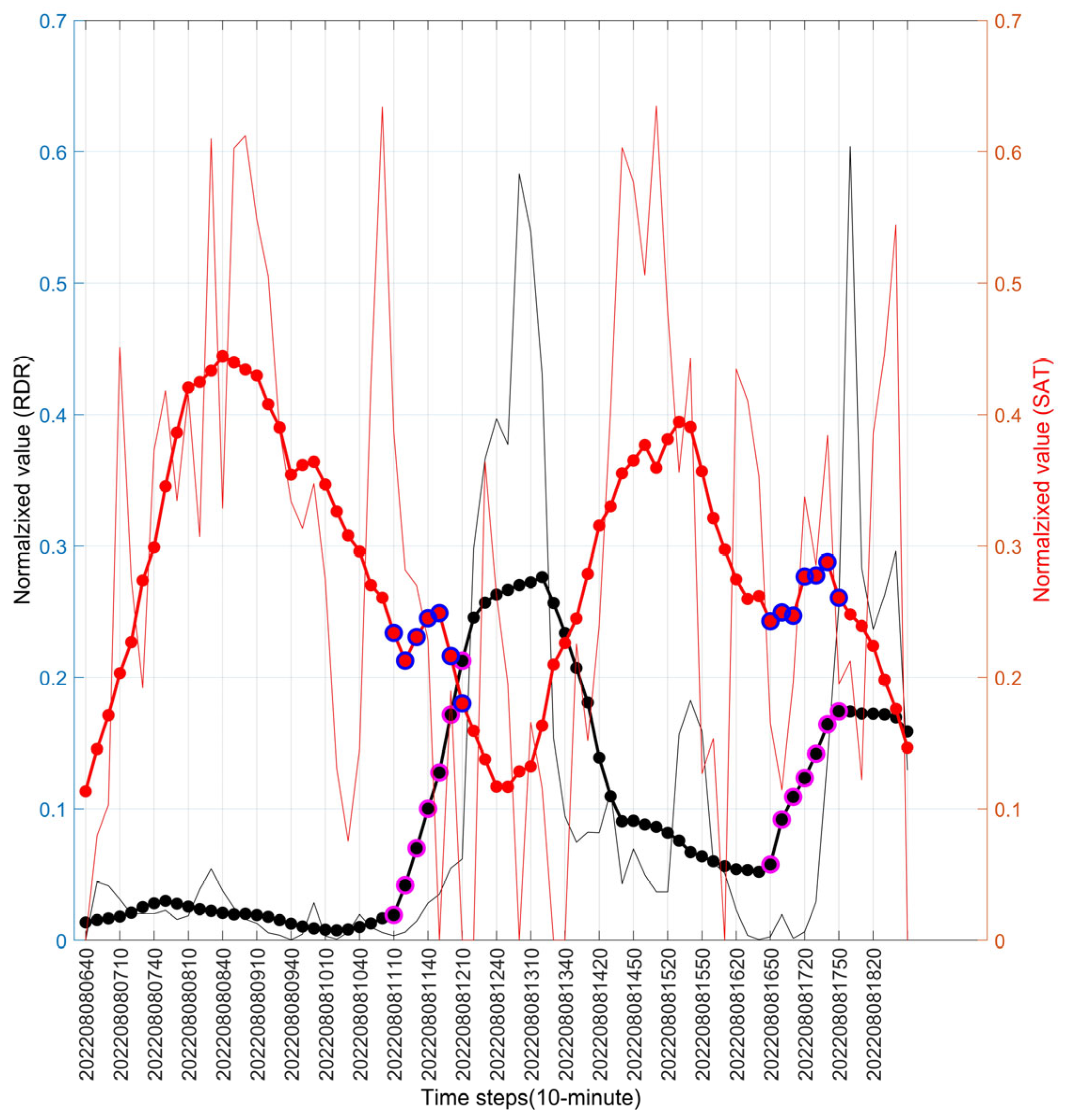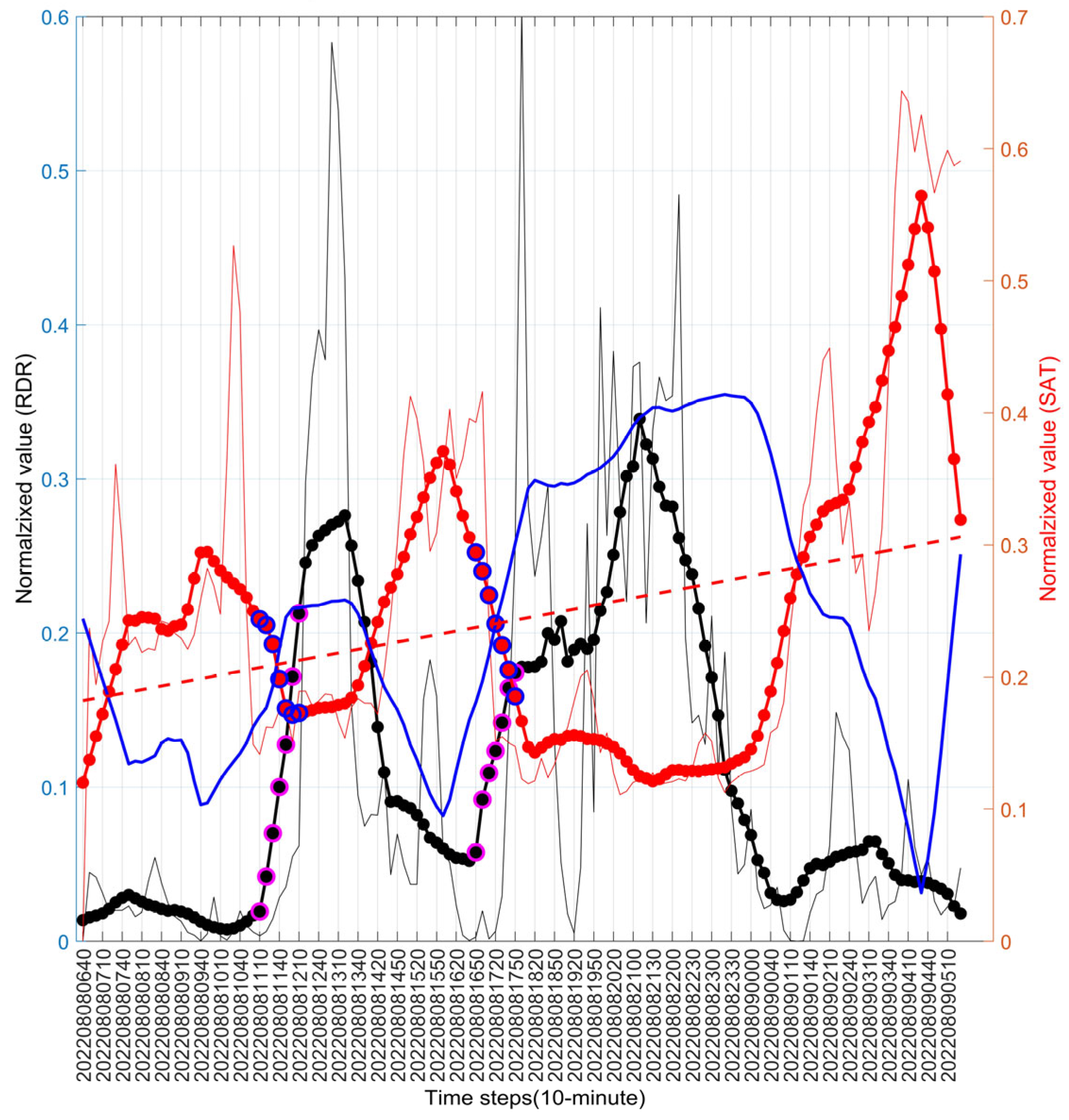 Figure 3 presents a time-series comparison between RDR and CTT for a major heavy rainfall event in Seoul (3 August 2020). The CTT exhibits a robust inverse relationship with radar-estimated rainfall, reflecting the temperature dependency of precipitation processes. Time-series analysis conducted during periods of significant rainfall intensity consistently reveals that decreases in CTT systematically coincide with increases in rainfall intensity. When the inverted CTT series (blue line) is plotted alongside rainfall, a positive correlated behavior emerges. Notably, the increase in the inverted CTT series appears earlier than the corresponding increase in radar-estimated rainfall, indicating that decreases in the original CTT precede and contribute to the intensification of rainfall.