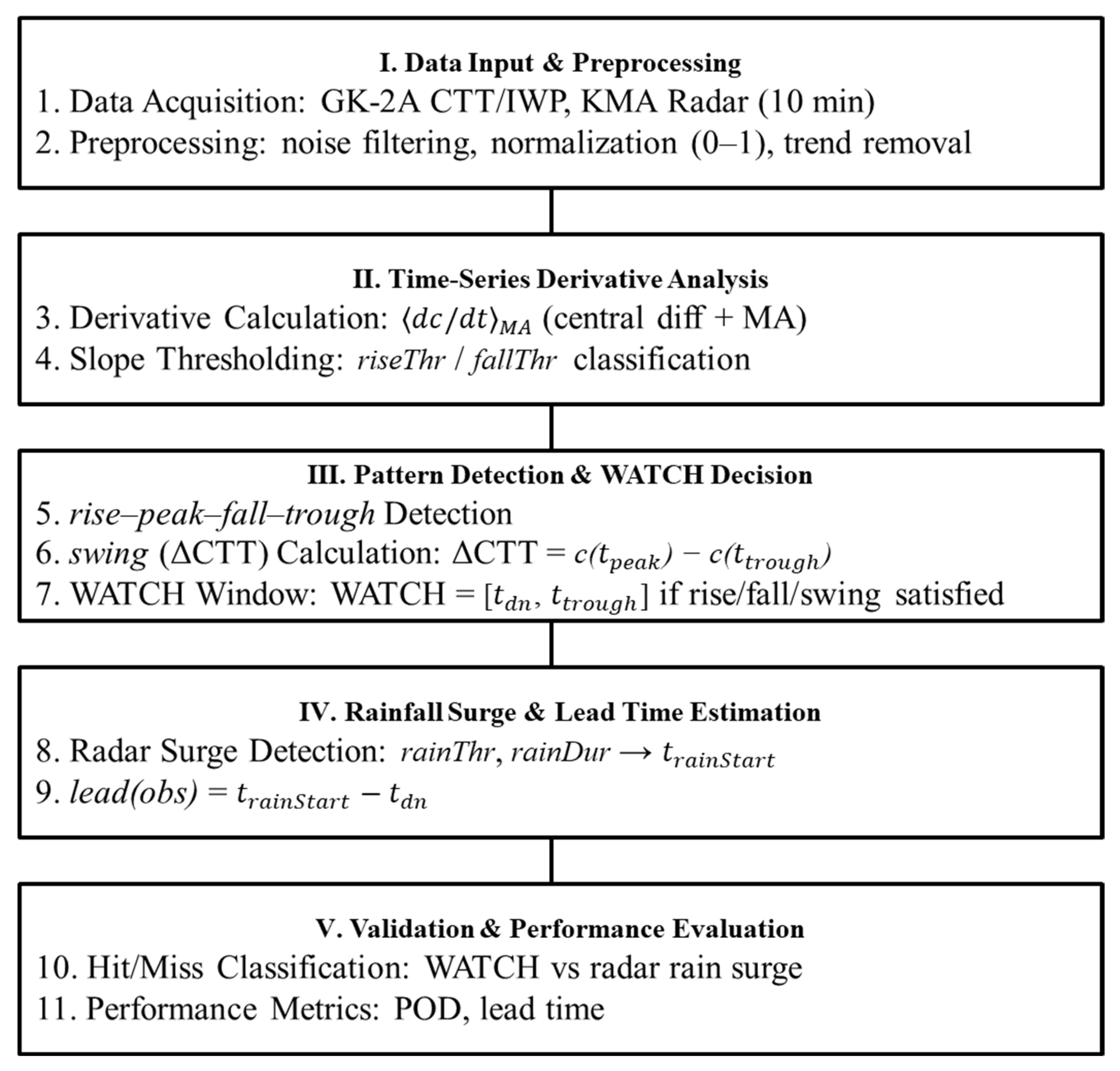 The method is an operationally applicable procedure that issues an early warning when the CTT time series exhibits a specific sequence of rapid followed by sharp . When a distinct – transition with sufficient swing amplitude is detected, the system declares a candidate pre-rainfall event and evaluates its timing against radar-observed surges.